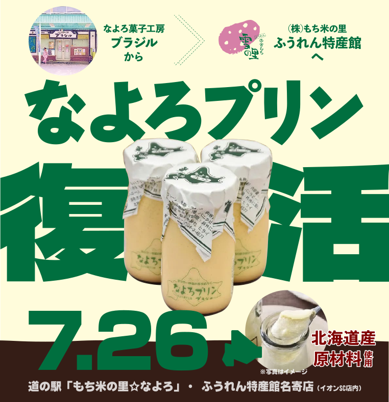 令和7年2月28日、惜しまれながらも閉店した【なよろ菓子工房ブラジル】。70年以上にわたり地域に愛された洋菓子店の想いと商品を「ふうれん特産館」が受け継ぎました。看板商品の「なよろプリン」に使用する、卵・牛乳・生クリーム・砂糖・小麦粉・バターはすべて 北海道産。地元の皆さまに愛されるだけではなく、その知名度は全国区で「プリン殿堂2006ご当地大賞」「2008入賞」の実績を誇る逸品です。ひと口ごとに広がるやさしい味わいをどうぞお楽しみください。
