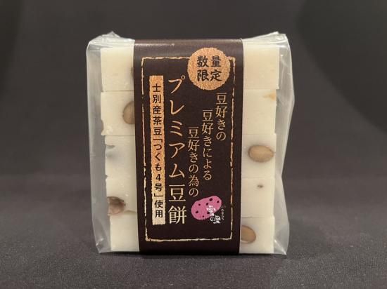 昔ながらの製法を守り、セイロで蒸し、臼杵で搗き上げた本物のお餅です。お餅の香り・粘り・コシが違います。昔懐かしい、少し塩が効いたお餅に士別産茶豆【つくも4号】の旨味が際立つ、数量限定プレミアム豆餅です。